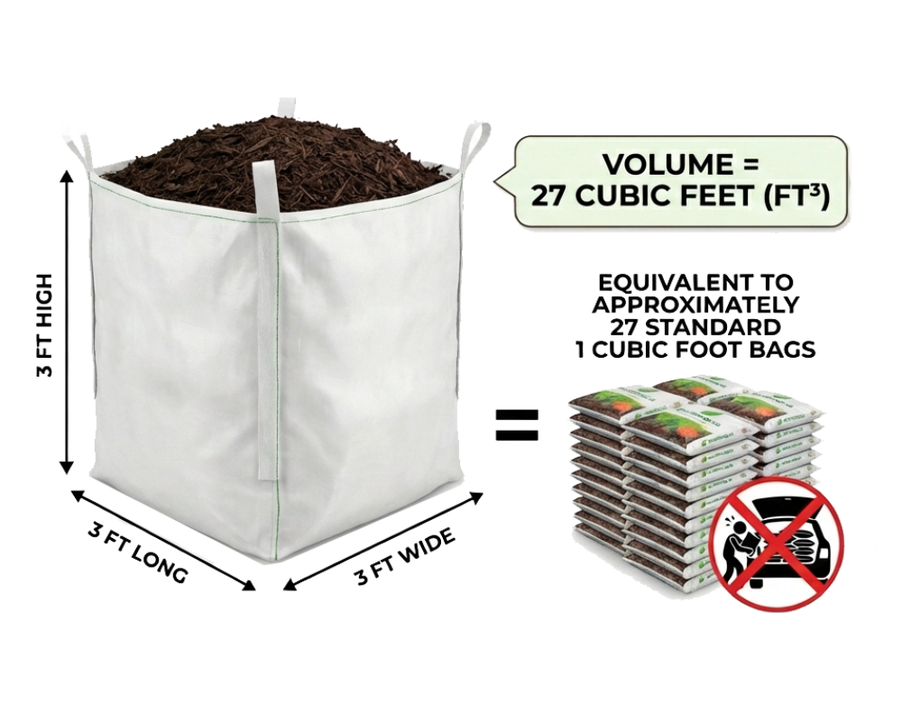 We get asked this question all the time. While we won’t get bogged down in the math, the time and effort you save is obvious. One cubic yard equals 27 cubic feet of material, which is roughly enough to cover 300 square feet at an inch thick.